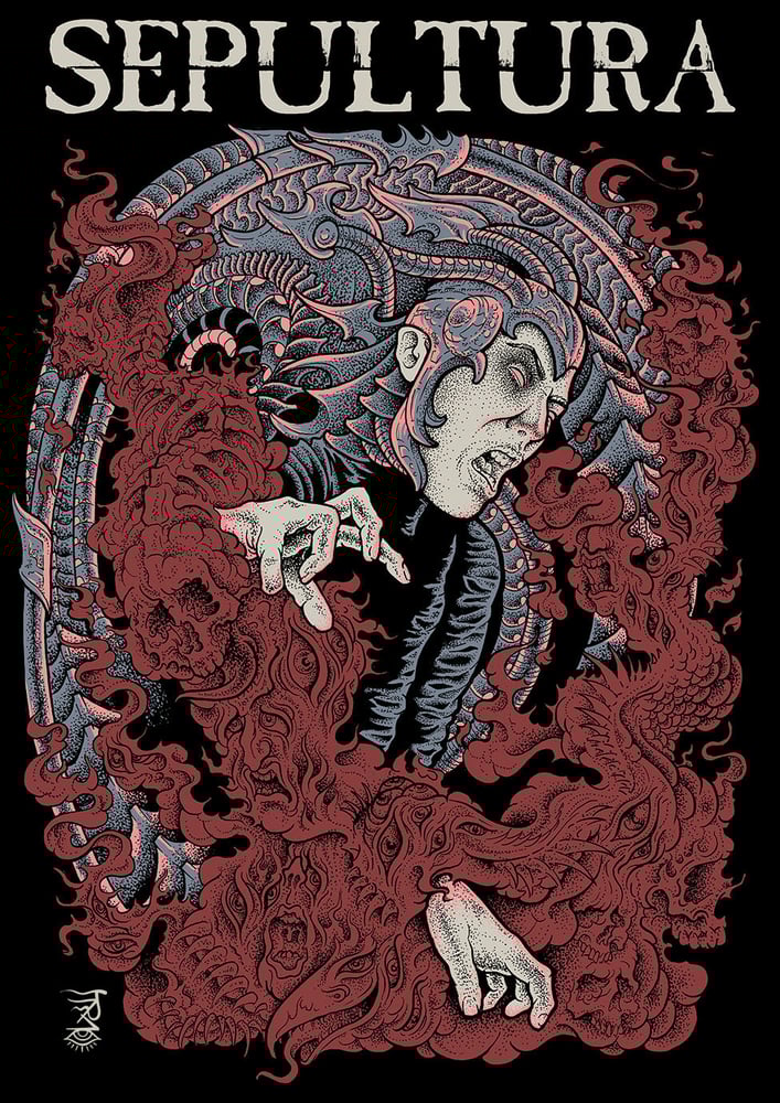“After immersing myself in the heavy complexities of ‘Quadra’, I found the inspiring lyrical theme across the tracks ‘Isolation’, ‘Means To An End’, ‘Last Time’ and ‘Raging Void’. The isolated, addicted and disconnected state of the human condition, in regard to the increasingly complex trappings of technology. Drawing inspiration from my usual background of comic books, skateboard graphics, tattoo culture and the illustration world, I’ve gone for a dense concoction of suffocating biotech meets Michael Whelan’s classic Sepultura art vibes. Complex artwork for complex times! It's a true honour to create this piece for one of my all time favourite bands, Sepultura. Having been a fan since 1991 and first seeing them at Donington Monsters of Rock 1994, this is a very special project that I’m humbled to share it with you all”.